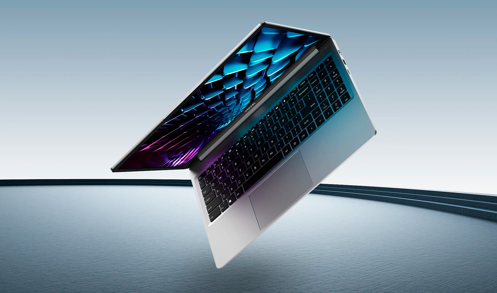 Серебристый алюминиевый корпус и классическое конструктивное исполнение делают ноутбук Tecno Megabook K15SFA не только прочным, но и привлекательным для повседневного использования.