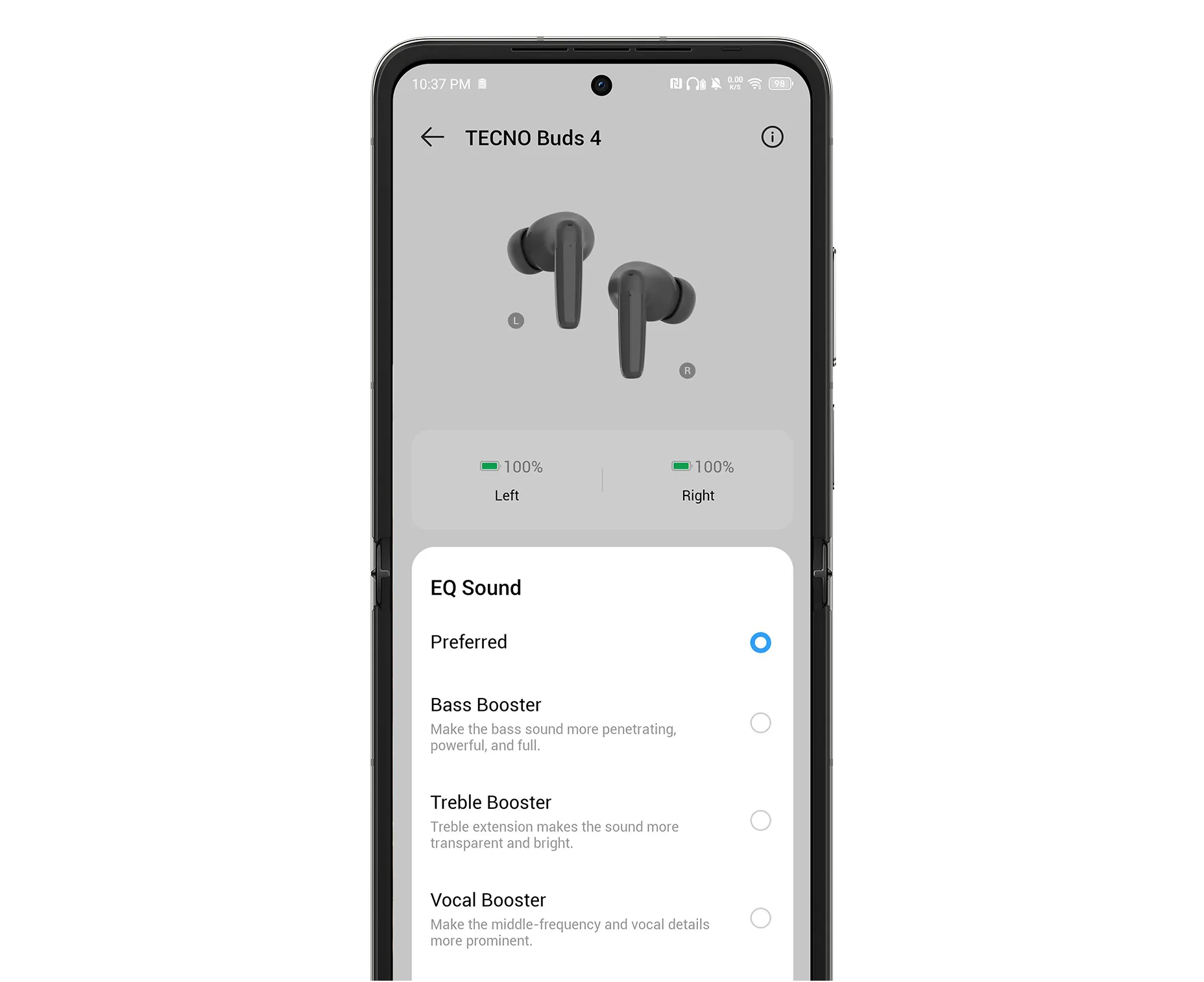 Настраивайте усиление низких, средних и вокальных частот, чтобы улучшить качество звука персонально для вас. Найдите идеальное звучание с помощью универсальных настроек эквалайзера в приложении Welife.