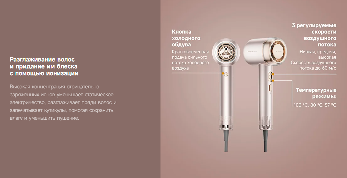 Низкий уровень шума — до 58 дБ — делает процесс сушки более комфортным. Длина сетевого шнура 2.8 м обеспечивает свободу движений во время укладки.