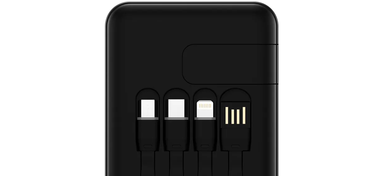 Модель выделяется наличием четырёх встроенных кабелей, что делает использование особенно удобным. На корпусе уже предусмотрены кабели USB-A, microUSB, Lightning и Type-C. Это полностью устраняет необходимость носить с собой дополнительные провода и позволяет заряжать практически любое устройство — от Android-смартфонов и гарнитур до аксессуаров Apple.