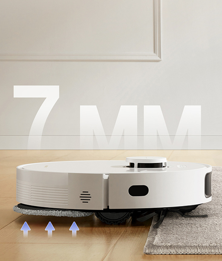 При обнаружении мягких поверхностей автоматически поднимает швабры на 7 мм, чтобы предотвратить их намокание, и переключается на режим усиленного всасывания. Резиновая щетка легко собирает даже самый мелкий мусор и препятствует спутыванию ворса.